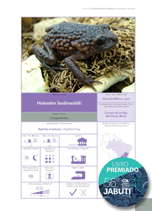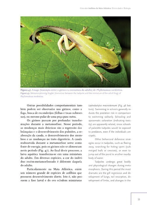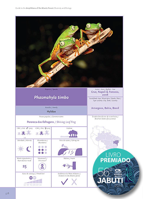 Este livro bilíngue Português/Inglês é o guia mais completo dos anfíbios da Mata Atlântica, bioma considerado como um hotspot de biodiversidade. O livro traz informação sobre alimentação, predadores, defesa, reprodução, girinos e conservação. São tratadas 457 espécies, que correspondem a cerca de 85% da diversidade total de anfíbios deste bioma.
