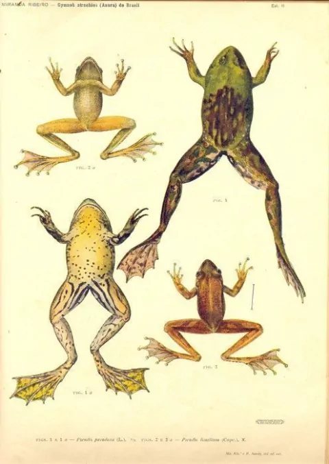 Reprodução de pranchas de: Notas para servirem ao estudo dos Gymnobatrachios (Anura) brasileiros de Alipio Miranda Ribeiro, 1926. Tamanho A3.